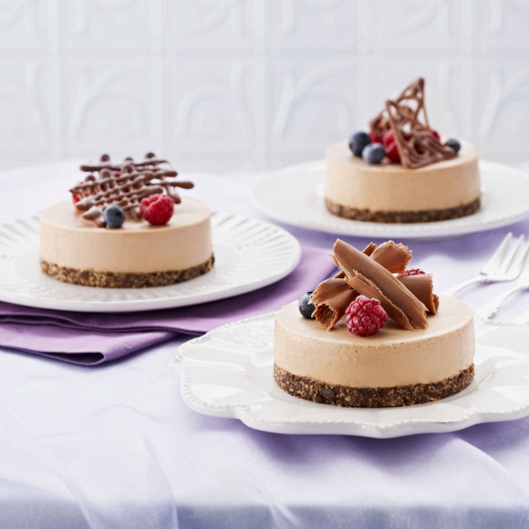 - POUR the mixture evenly over the prepared bases. Chill for 2 hours or until set. Decorate with fresh berries and chocolate curls prior to serving