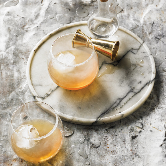 - Meanwhile, chill a cocktail glass. Just before serving dip the edges of the glass into the smoked sugar. Set aside