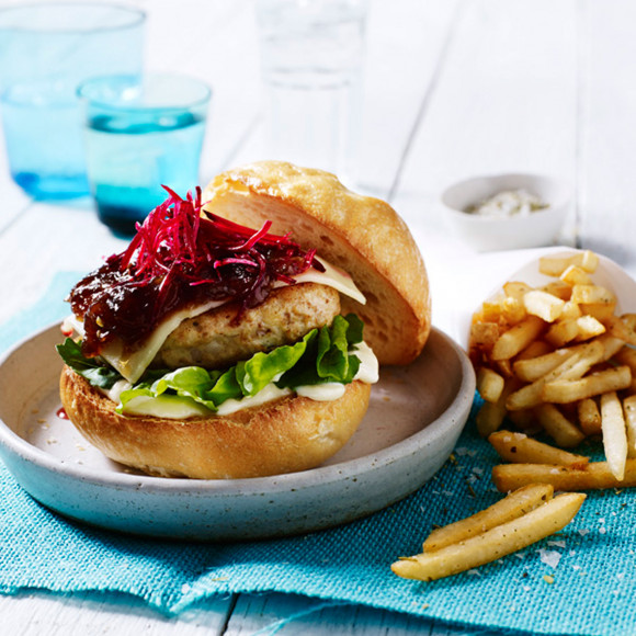 Related: Lunch Dinner Burgers Mince Chicken Poultry Summer School Holidays Spring Weekends Picnic Party BBQ Baby and Bridal Showers New Year's Eve / Day Holidays Australia Day Fusion Family Dinners Football Finals Free Range Aioli beetroot bread rolls breadcrumbs Chicken mince Eggs Garlic lemon thyme onion jam Red Onions swiss cheese