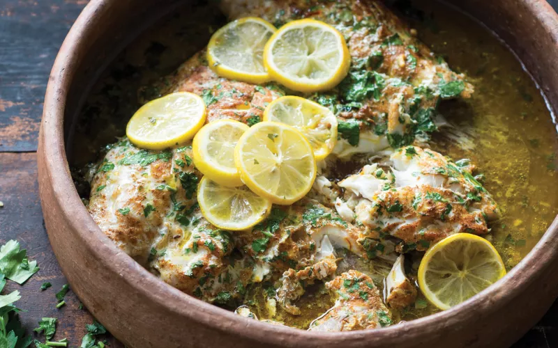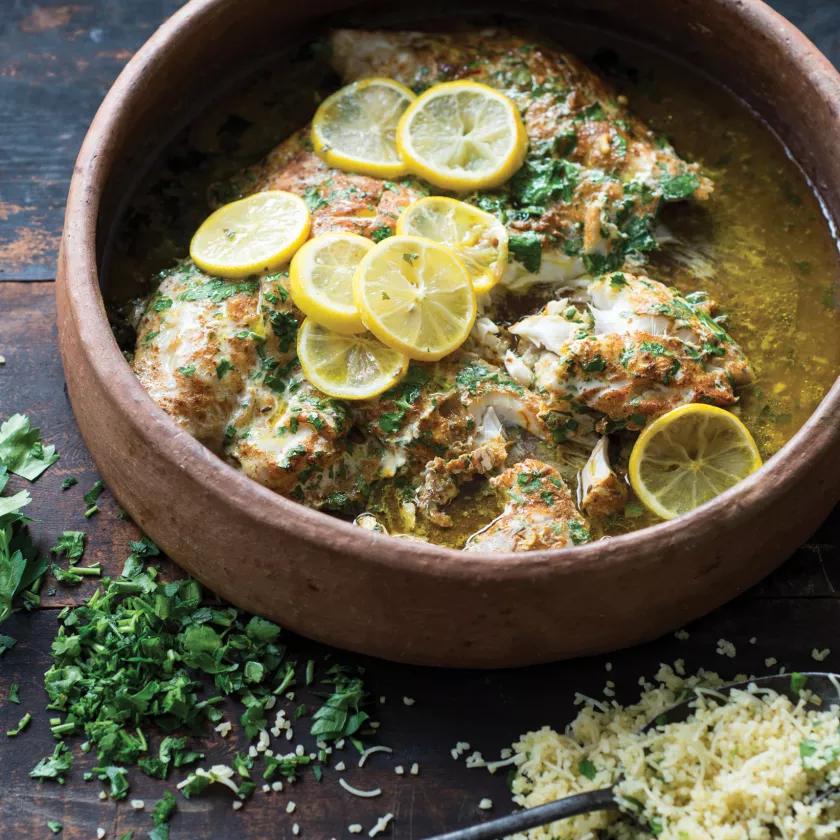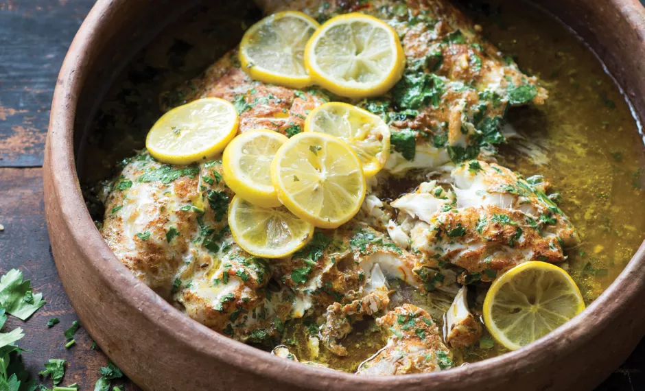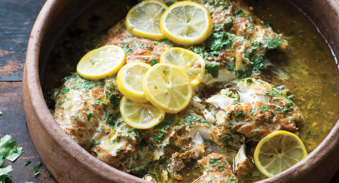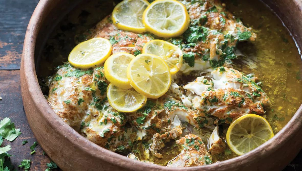 - You will need a clay pot or a wide flat ovenproof dish. Toss the fish with the spice mix, three-quarters of the parsley leaves and the butter and place in the clay pot or dish. Leave to marinate at room temperature for 30 minutes
