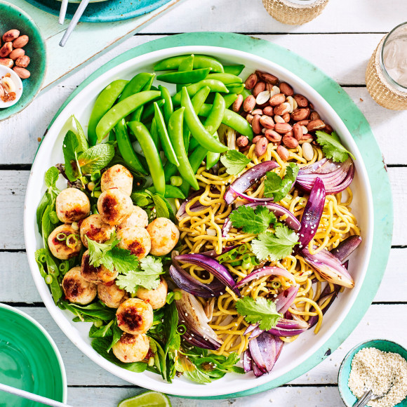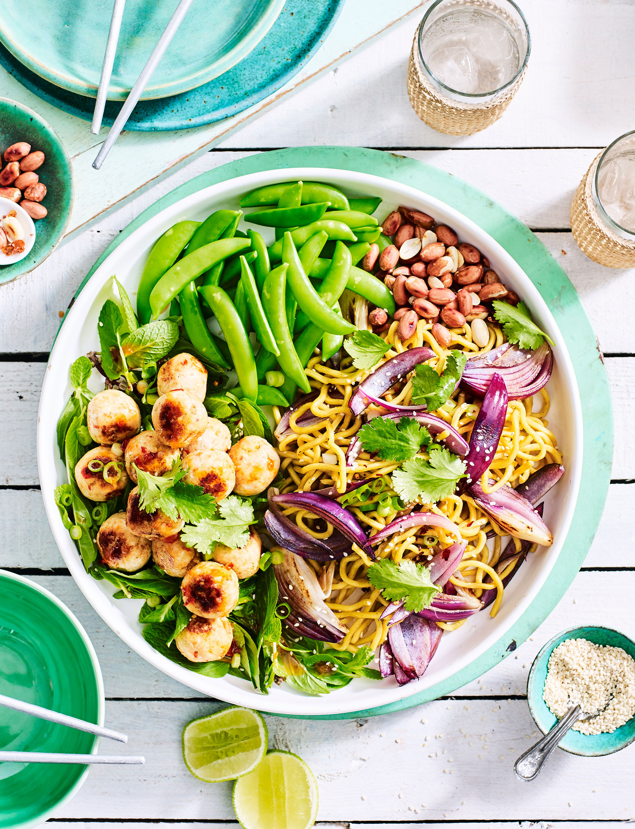 - Serve to a large sharing plate or platter. Add noodles, meatballs, herbs, nuts, sugar snap peas. Drizzle meatballs with sweet chili and lime dressing, and then garnish with chilli flakes, sesame seeds and coriander leaves