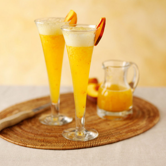 - Add the champagne. Select variable speed 2 and run the machine for 2 - 3 seconds. Pour into cocktail glasses, decorate each one with 1 slice of peach and serve