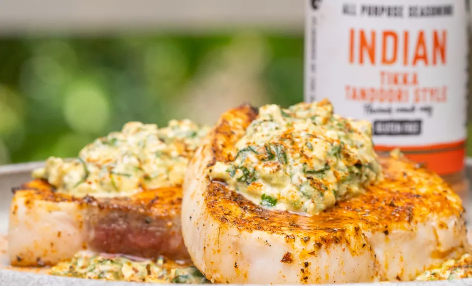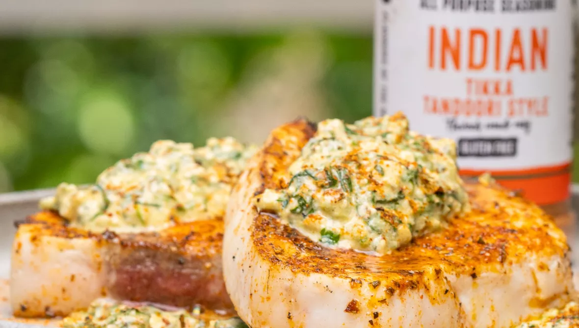 1. Rub the swordfish steaks with extra virgin olive oil and season generously with Street BBQ Indian seasoning