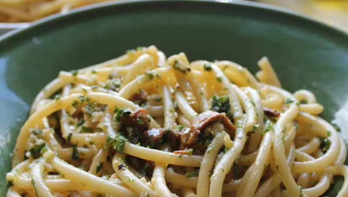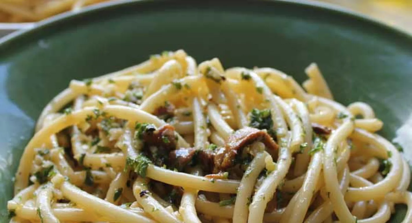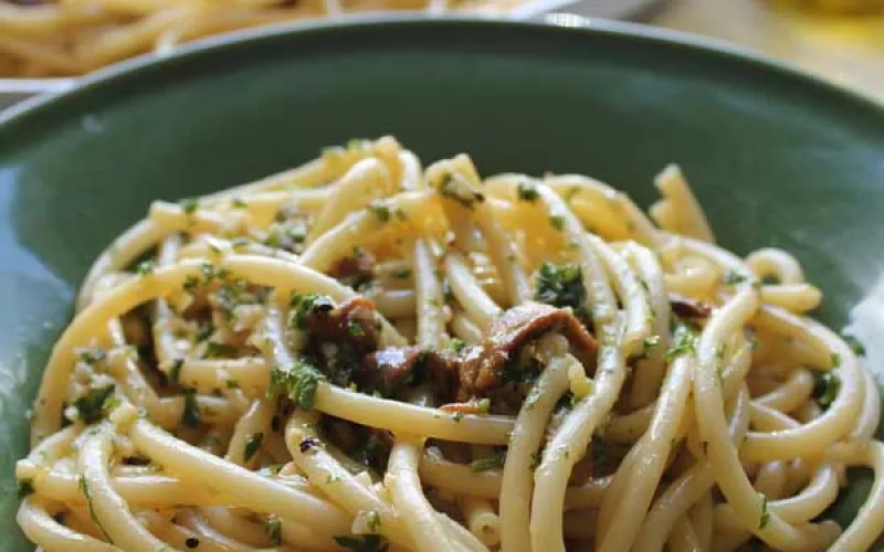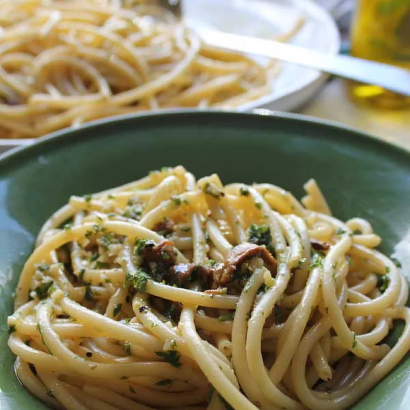 - While the pasta is cooking, place a frypan large enough to hold the pasta onto a moderate flame. Add in the oil, warm the oil for 20 seconds and then add in the garlic and the parsley. Ensure the pan does not get too hot as the key is not to fry it until it changes colour or it will taint the flavour of the pasta.