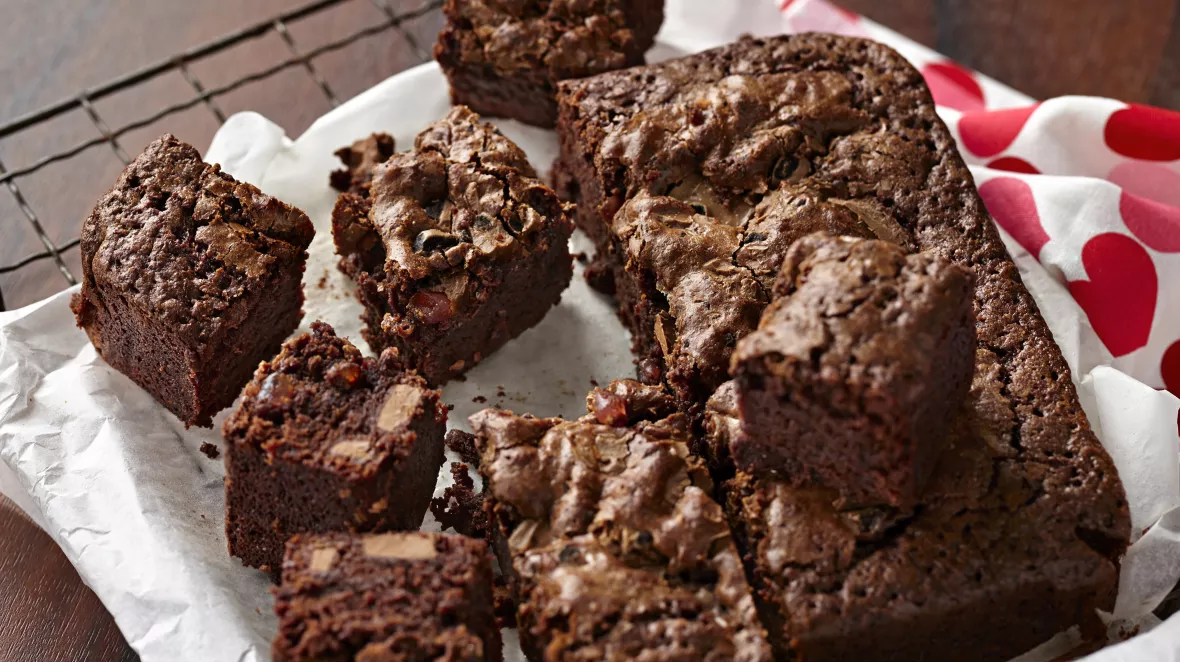 - COMBINE the butter, eggs and vanilla then stir into the dry ingredients with half the chocolate. Pour into prepared pan and scatter remaining chocolate over the top