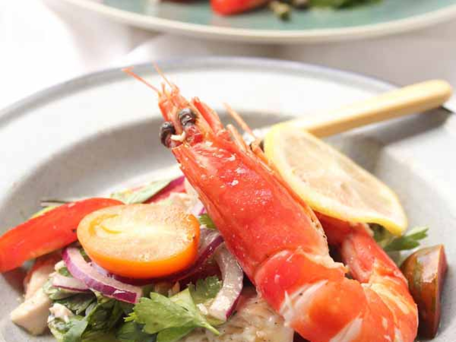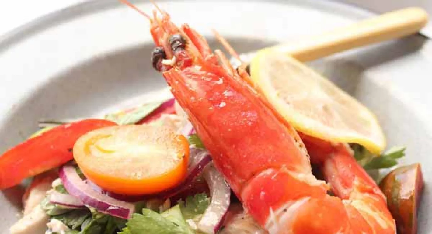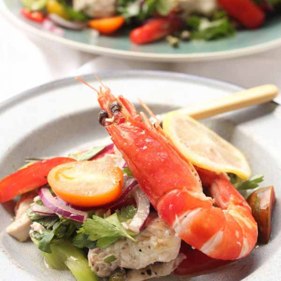 - Prepare the salad by slicing the blanched tomato into quarters and then into thin slices, place the tomato into a serving bowl or platter. Add in the halved cherry tomatoes, the sliced celery, onion, capers, torn basil and roughly chopped parsley. In a separate bowl combine the chili flakes with the olive oil, lemon juice, lemon slices and season well with salt and pepper. Pour the dressing over the salad, flake in the poached cooled fish and toss gently to cover with the dressing. Garnish with the cooked prawns and serve.