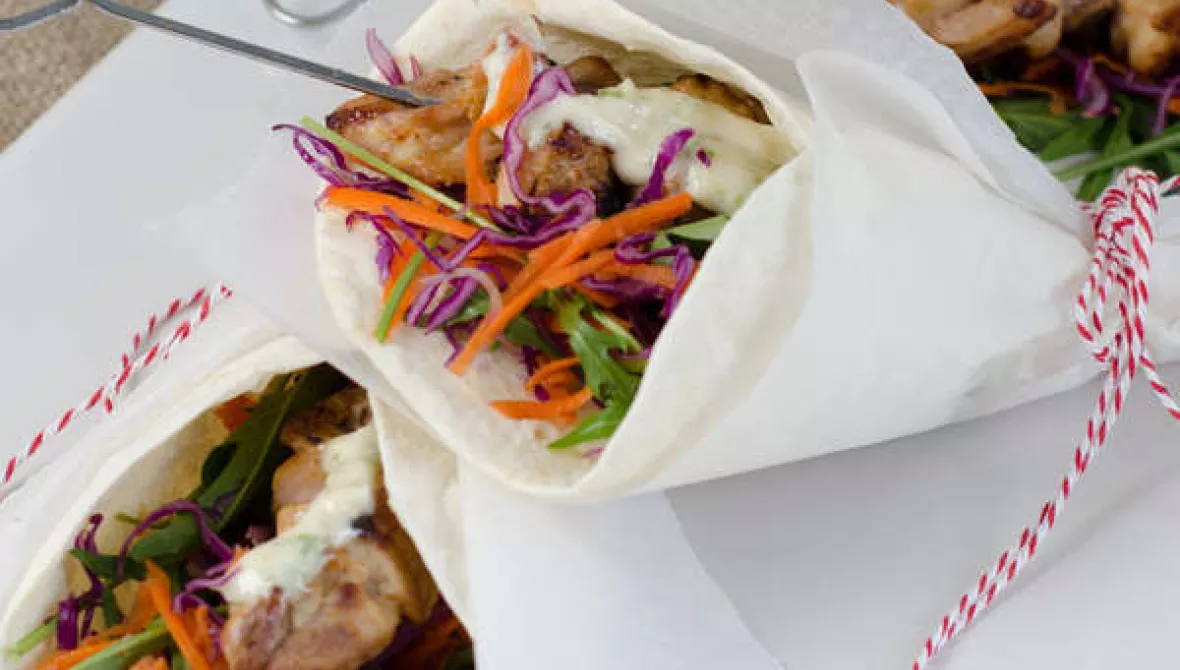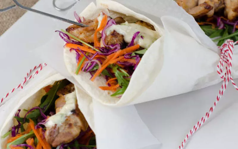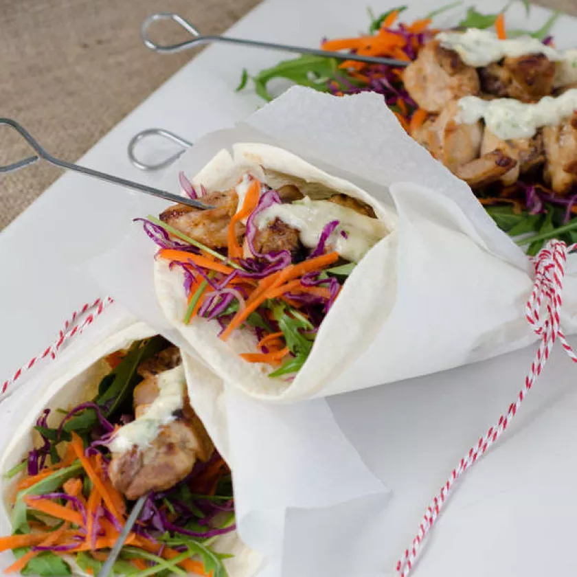 - To serve, spread a spoon of aioli in the middle of the pitta. Place a handful of salad mix and sit the chicken skewer on top. Fold the pitta over and pull the skewer off the chicken. Serve with more aioli on top