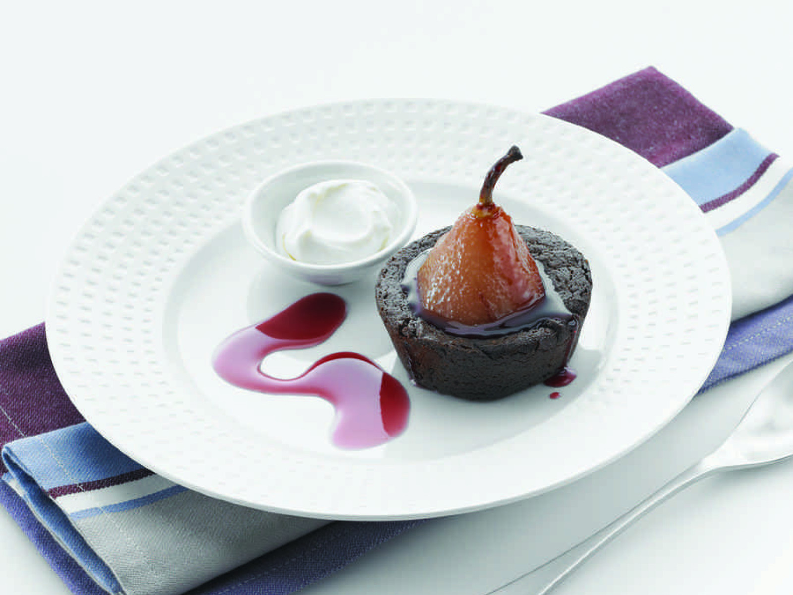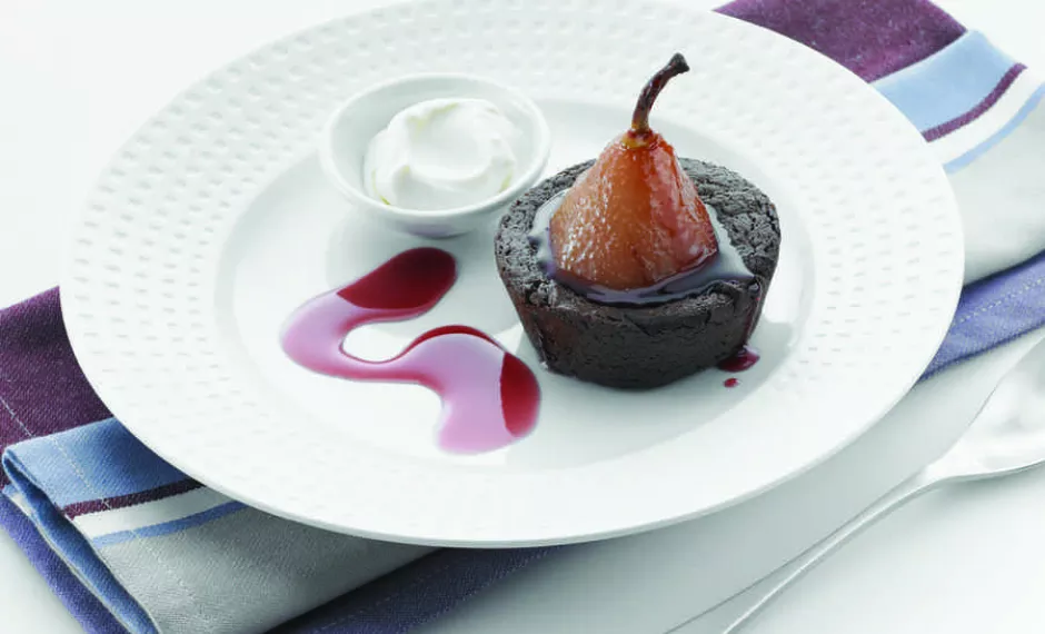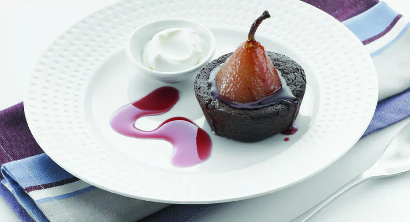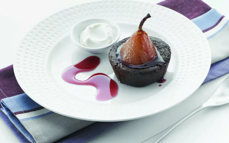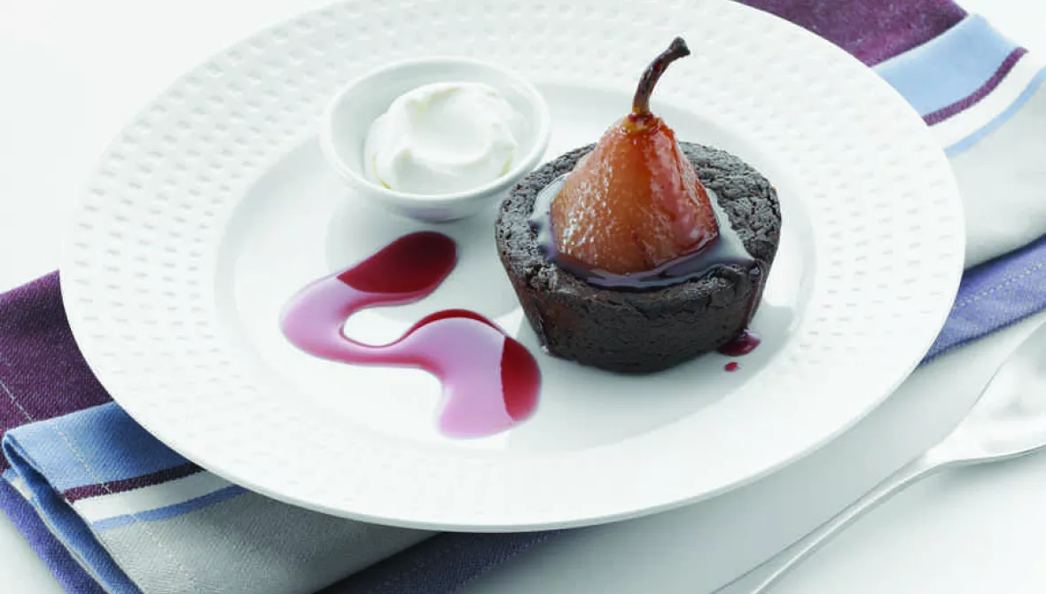5. Divide the mixture between 12 Texas, greased and base lined muffin pans. Place a pear in the centre of each. Bake in a moderate oven 180°C for 20 minutes or until cooked. Cool slightly before turning out. Serve warm with red wine syrup