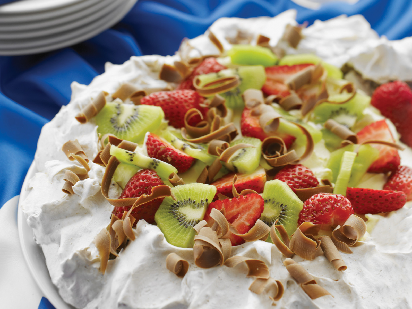 - Fill the centre of the pavlova with the cream and decorate with berries and chocolate. Serve immediately