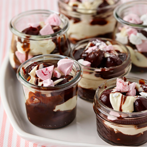 - SPOON half of the cherry sauce evenly into the base of 8 serving glasses or jars. Sprinkle half the meringues and cherries into the glasses, followed by half the PHILLY mixture.