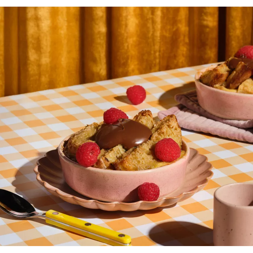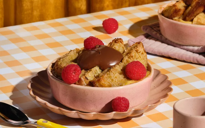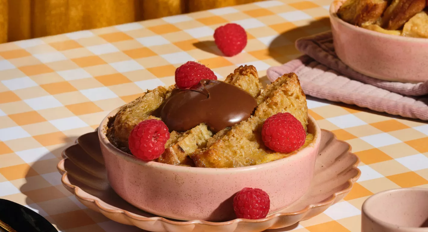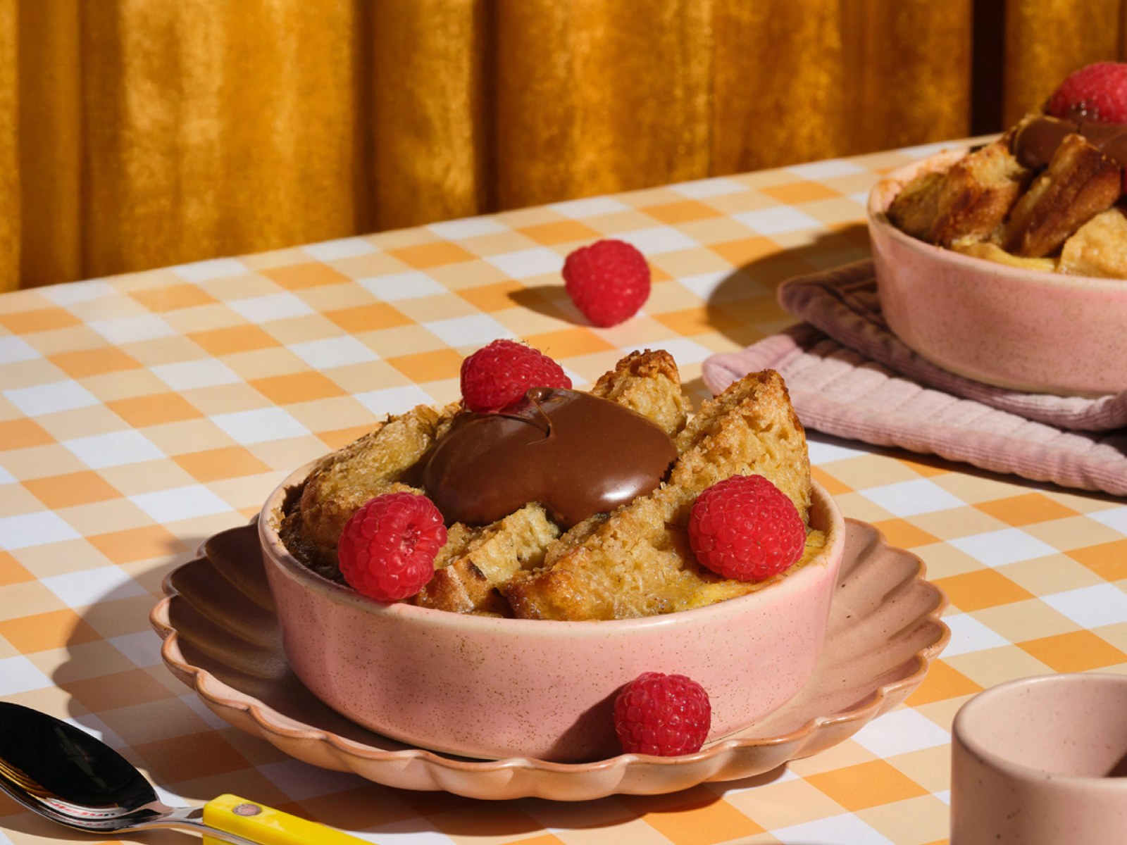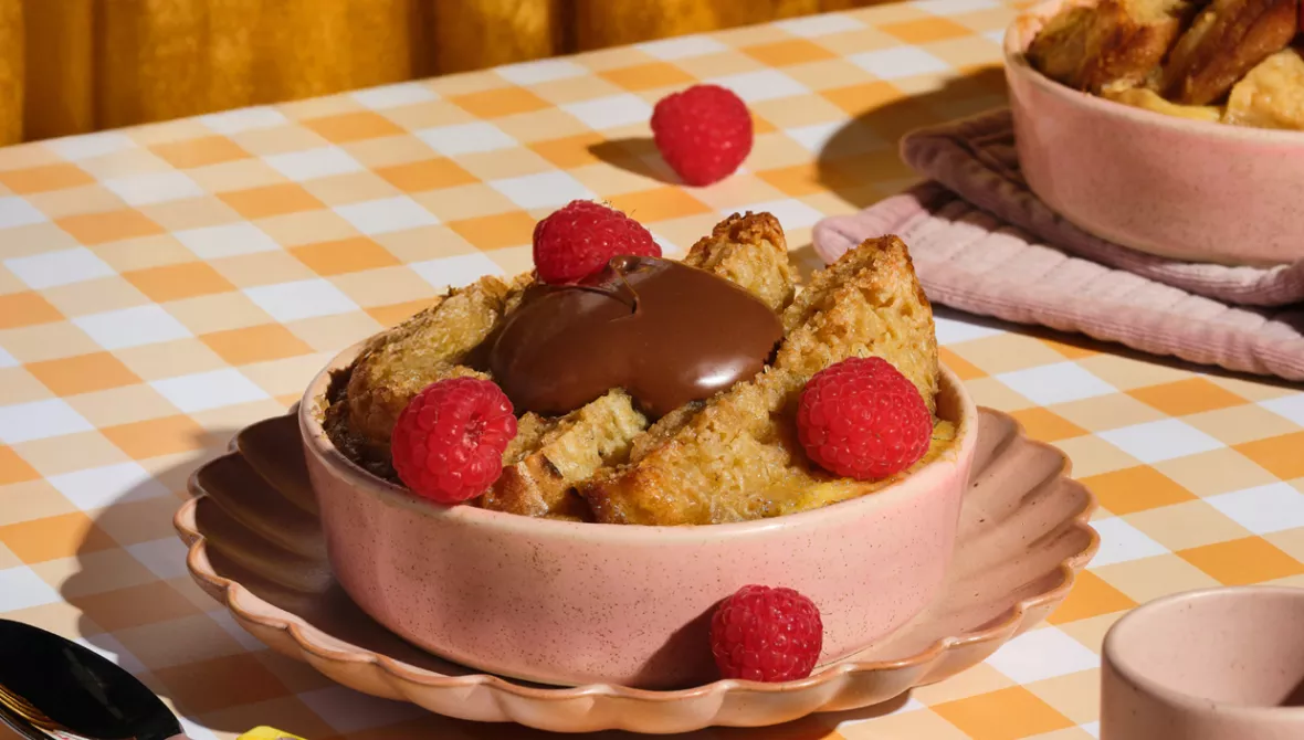 Crumpet Bread and Butter Pudding with Nutella is golden, custardy and indulgent. Buttered crumpets soak in cinnamon vanilla custard, baked until set and topped with Nutella and raspberries.