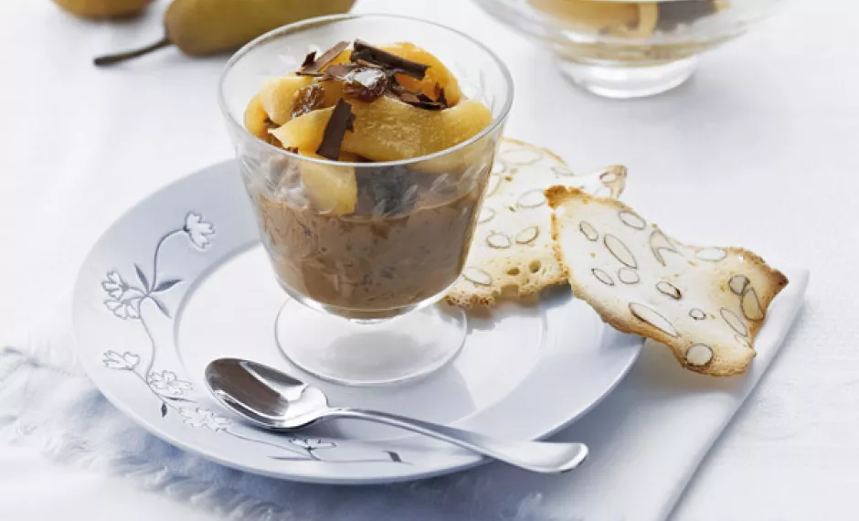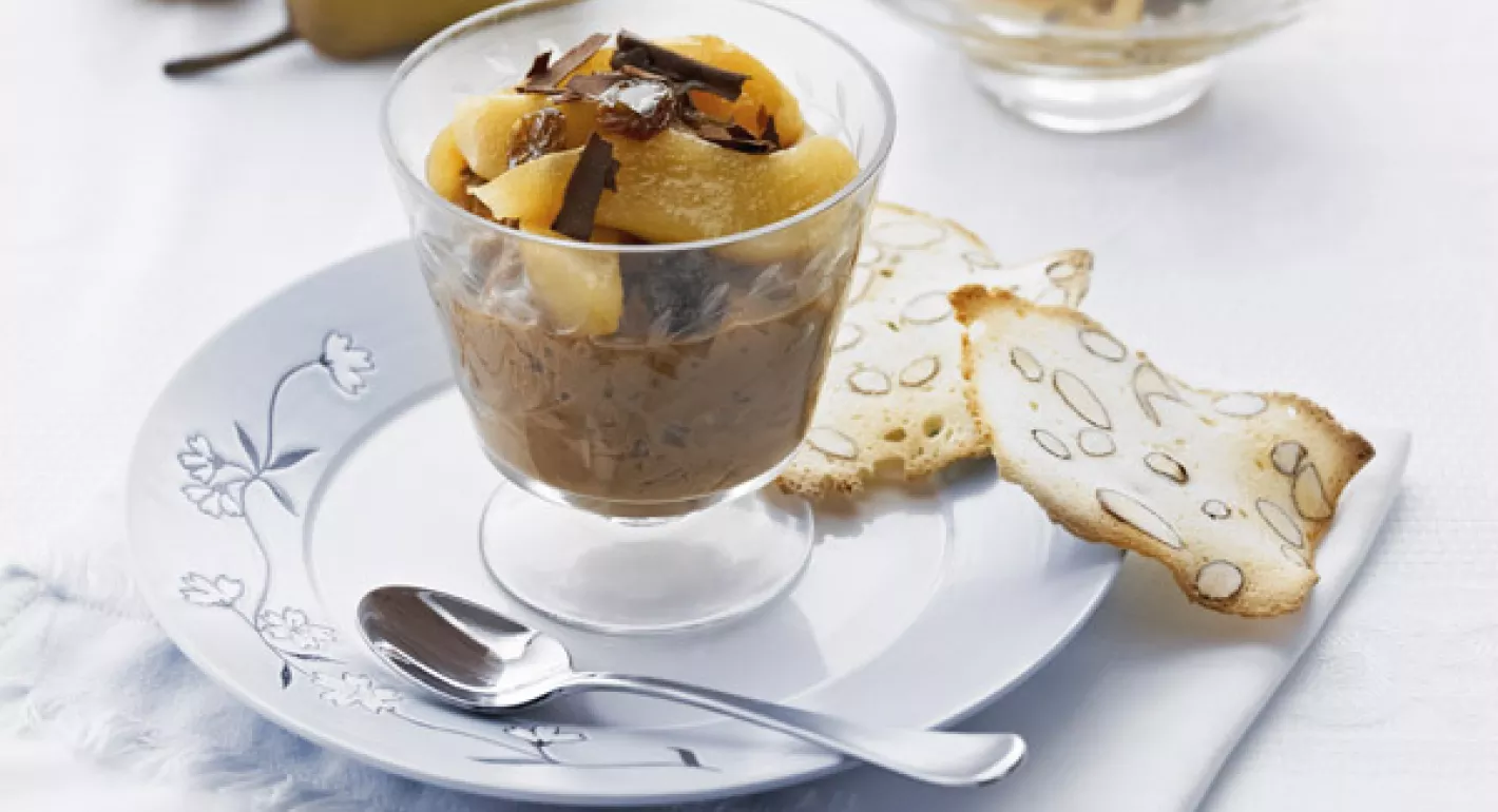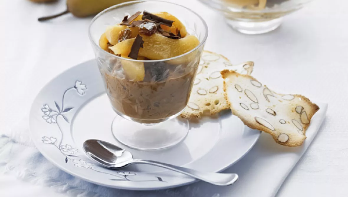 Dark Chocolate Rice Pudding with Rum 'n' Raisin Pears