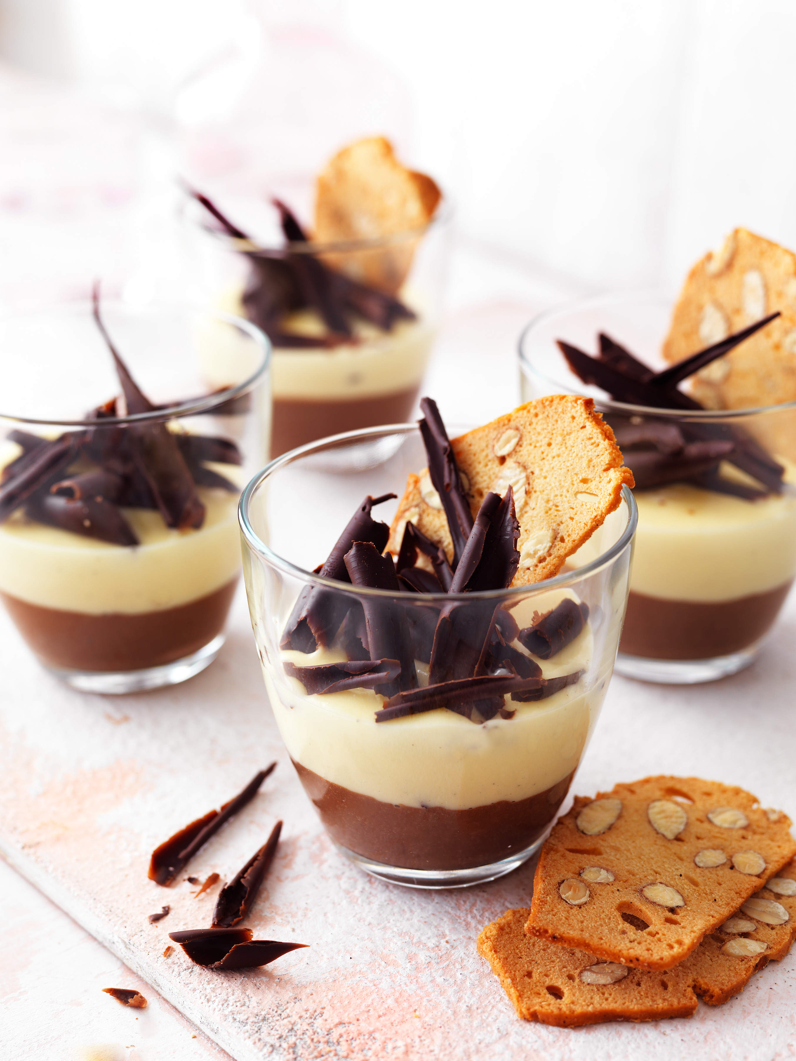 2. Divide chocolate custard evenly between 4 serving glasses, then top with a layer of the brandy custard. Garnish with chocolate curls and serve with biscotti.