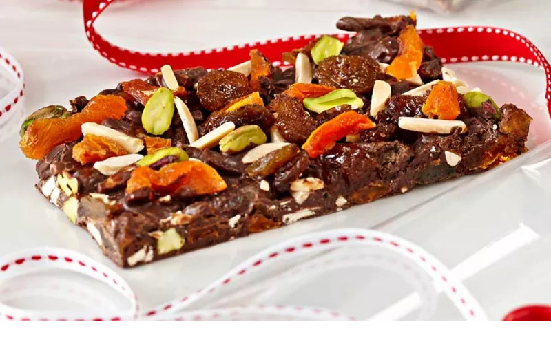 FOLD the melted chocolate and mixed spice into the fruit mixture. Spread into a lined 28cm x 18cm slice pan. Sprinkle with reserved fruit mixture and press down gently