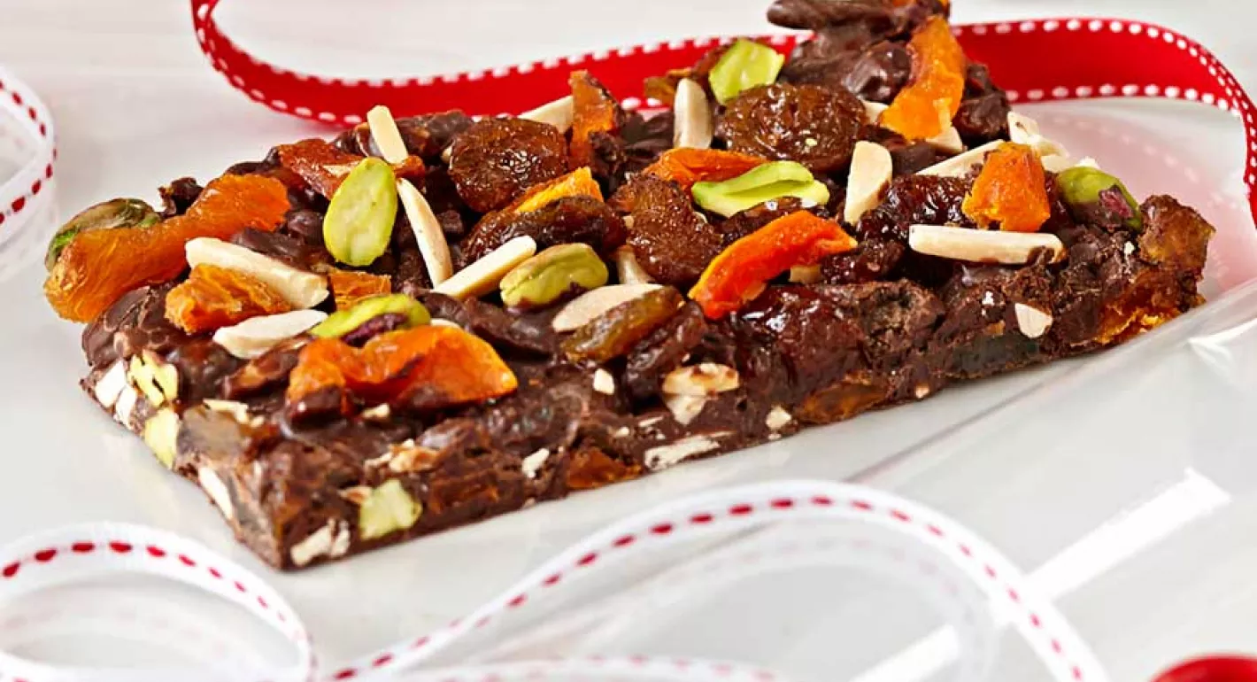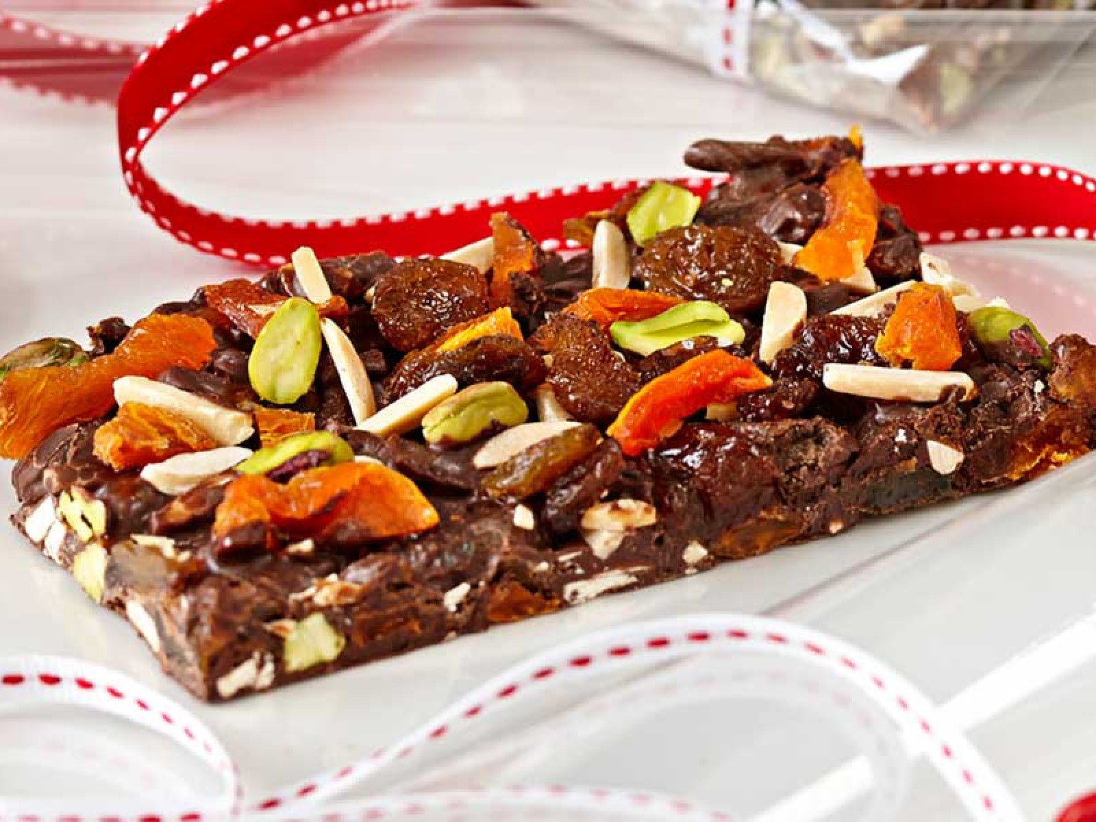 FOLD the melted chocolate and mixed spice into the fruit mixture. Spread into a lined 28cm x 18cm slice pan. Sprinkle with reserved fruit mixture and press down gently. Chill for 30 minutes or until firm. Cut into pieces and serve or, store in an airtight container