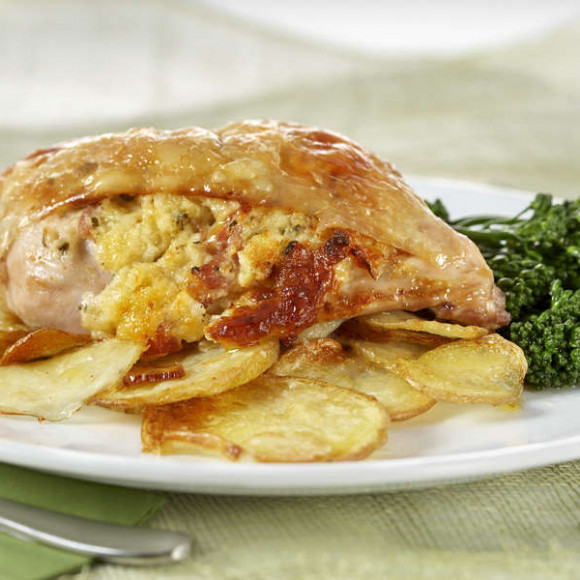 - Using wet fingers loosen skin from chicken flesh to form a pocket and fill with cheese mixture. Combine potatoes, oil, sliced garlic and seasonings in a large roasting pan.