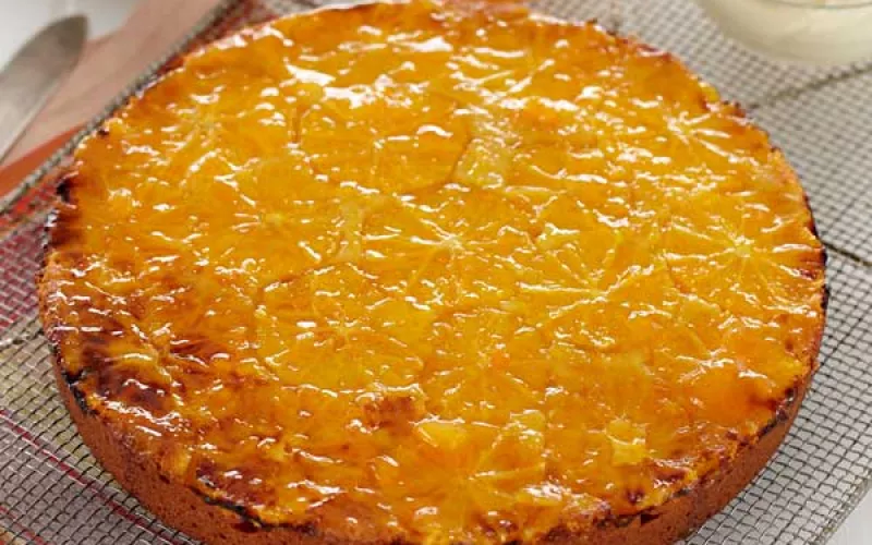 - REMOVE the pith from the oranges and cut into 1/2 cm thick slices and arrange on the base of a greased and base lined 23cm round cake pan. Spoon the mixture over the oranges in pan