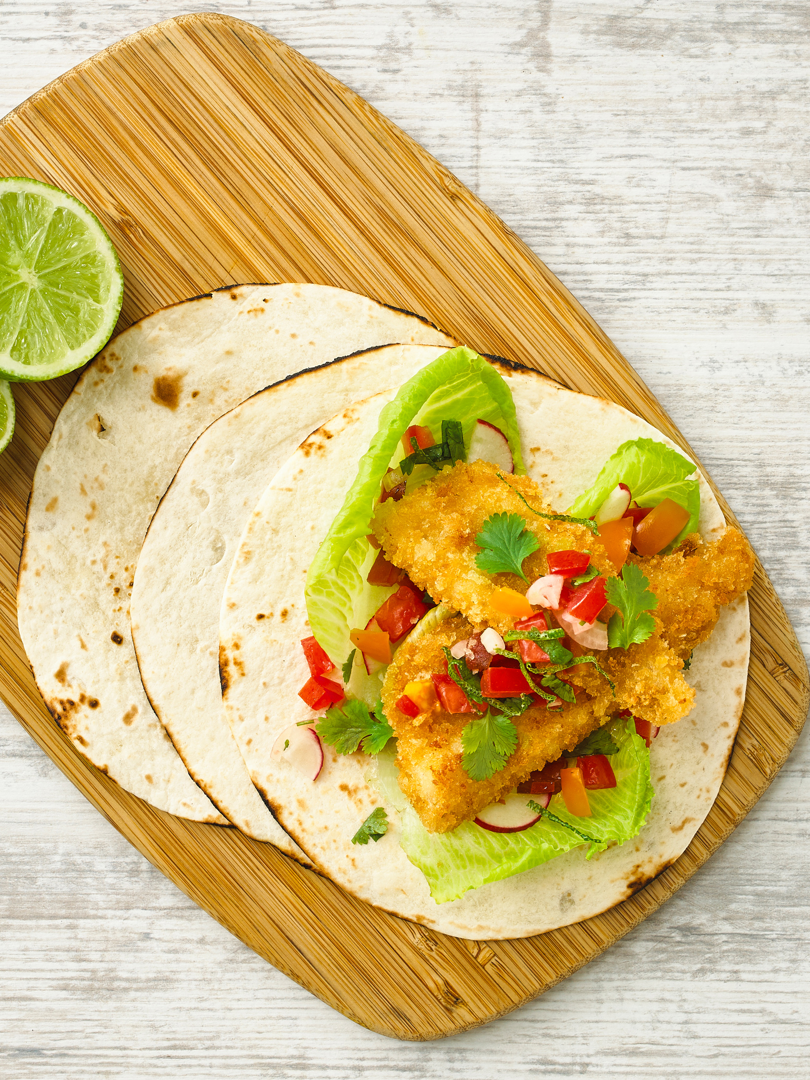This quick and easy golden fish taco's with fresh tomato salsa is an easy weeknight dinner. Made even easier with De Costi pre-crumbed whiting fillets. Enjoy these fish tacos with a fresh tomato salsa.