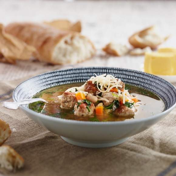 Easy Italian dinner recipe with homemade meatballs. Fill up your bowl with vegetables and serve with cheese and fresh herbs. Make a double batch and freeze meatballs for times where you need a quick recipe idea.