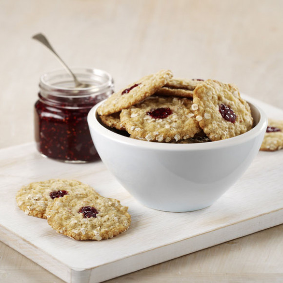 - Make a small deep hole in the centre of each biscuit using the top of a round handled wooden spoon and place 1/4 teaspoon jam into each hole.
