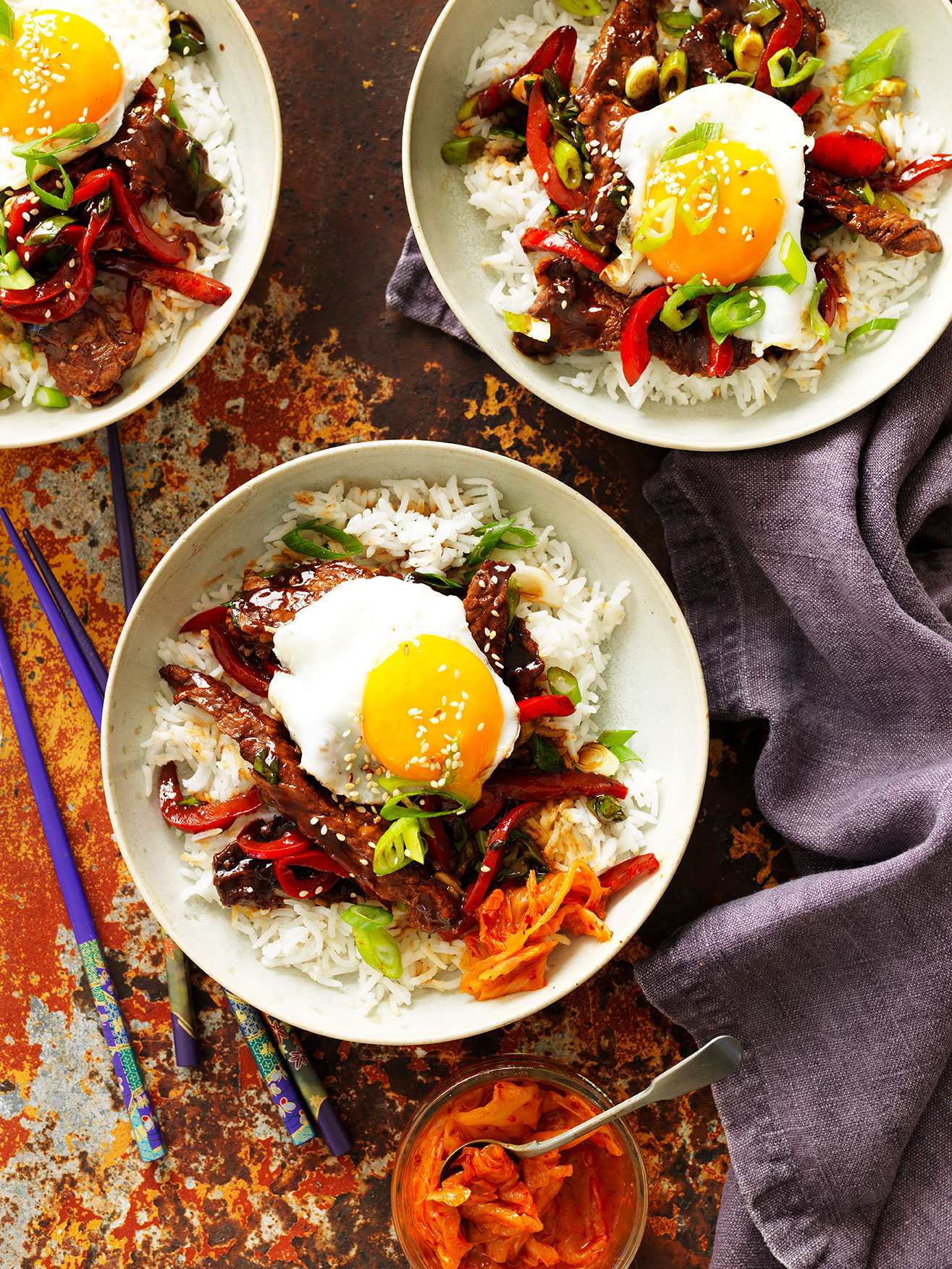 - Heat remaining oil in a frying pan over medium heat. Fry eggs for 3 minutes or until egg whites are cooked through. Spoon rice onto serving plates. Top with steak and vegetable mixture. Sprinkle with sesame seeds and extra scallion. Place an egg on top of beef and serve with kimchi
