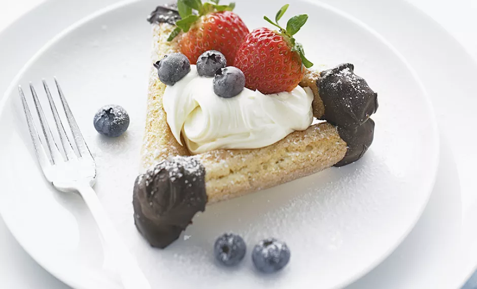 1. COAT both ends of three sponge finger halves in chocolate. Place the pieces on a lined tray to form a triangular shape.