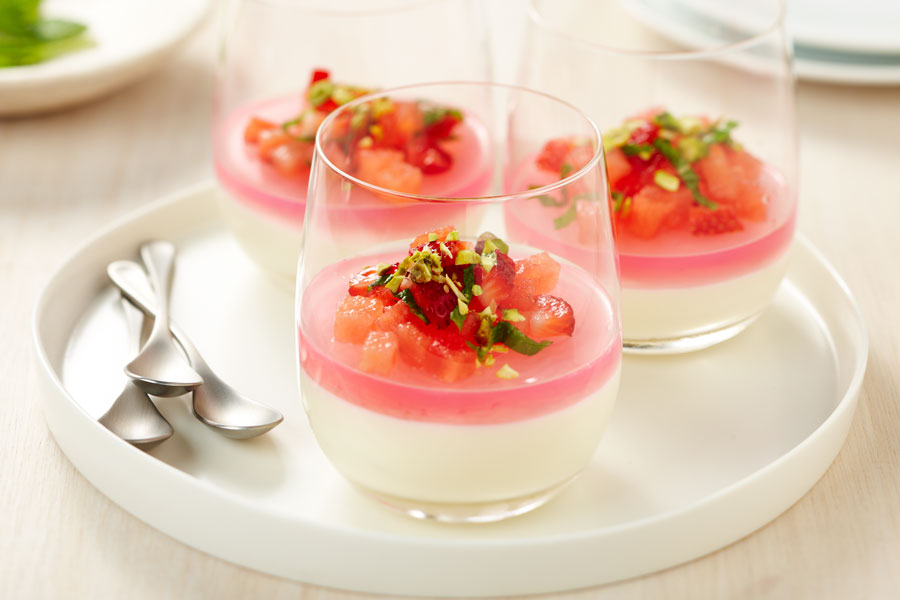 Milk Pudding with Rose Jelly, Watermelon, Strawberry and Mint Salad