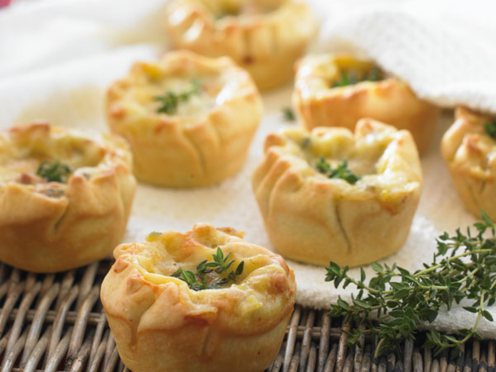 - Gently pleat and fold in the pastry to form a collar around each pie. Sprinkle with the remaining cheese