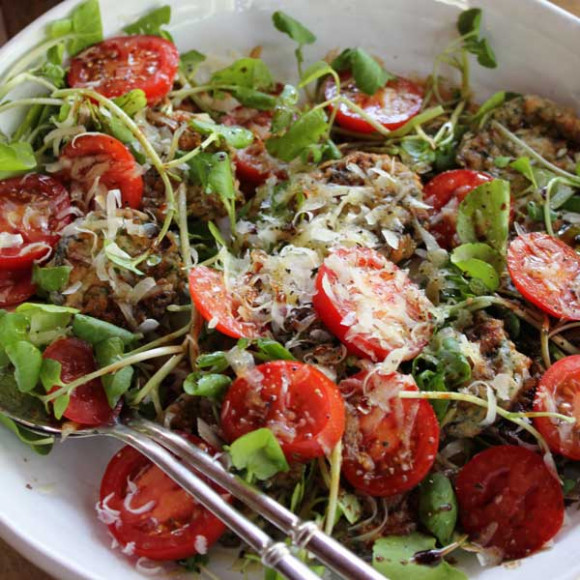 - Lay the eggplant onto a large platter and scatter over the tomatoes, then the watercress and then the grated pecorino. Combine the olive oil with the balsamic vinegar and season with salt and pepper.