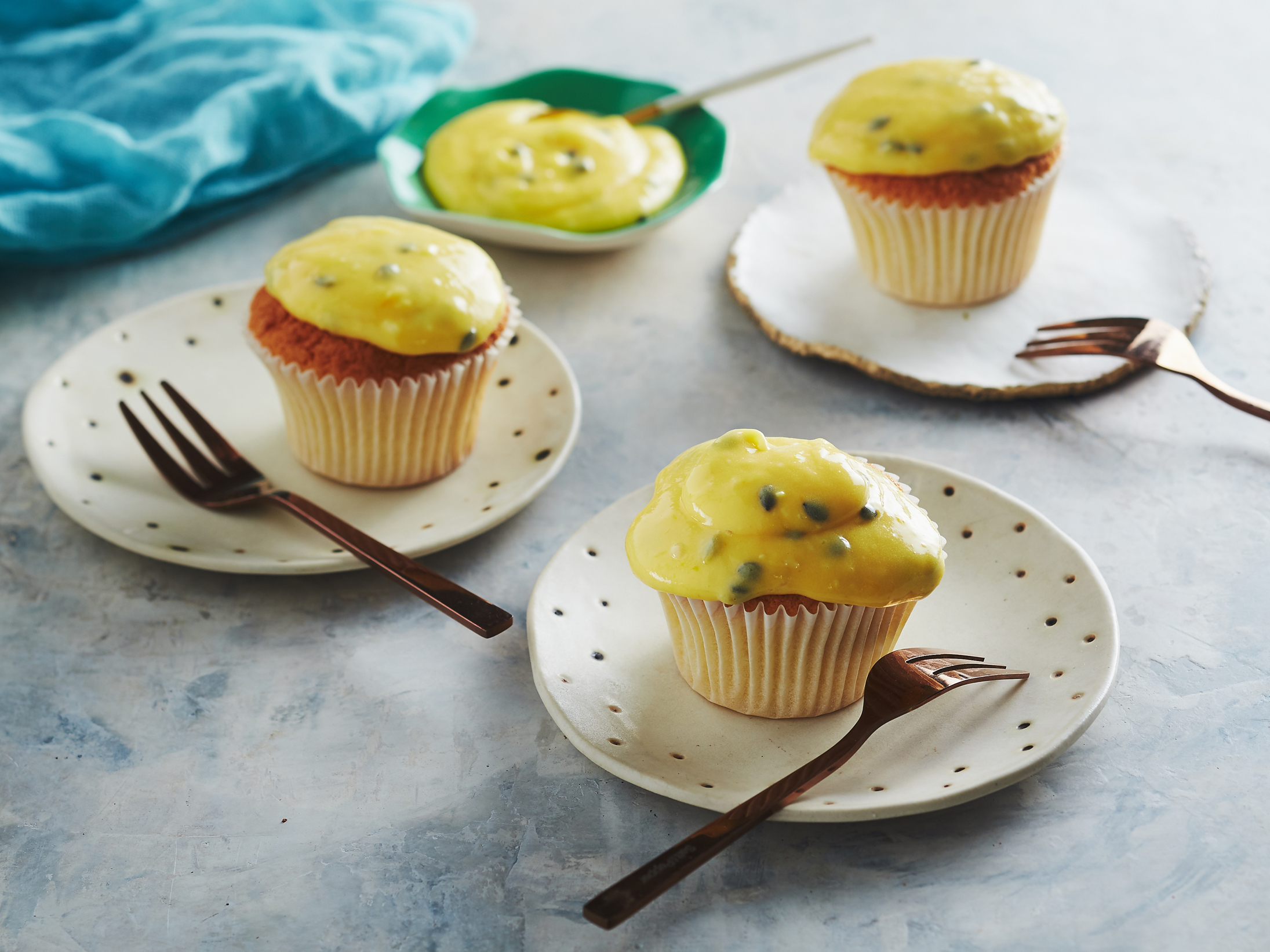 - Spoon batter into paper cases and bake until golden, approximately 12 minutes. Remove from pan and cool completely on a wire rack. Top with a dollop of cooled passionfruit curd to serve