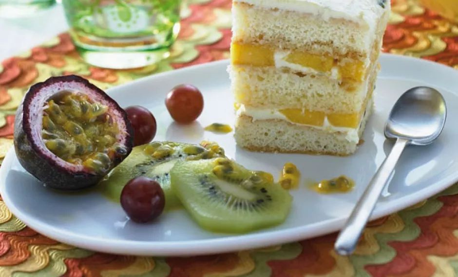 - Gently remove the Tiramisu from the pan. Carefully remove the lining paper, cut into 8 slices and place onto serving plates with fresh fruit. Drizzle with additional passionfruit pulp and serve immediately