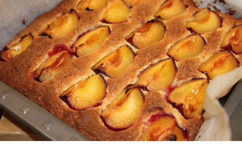 - Spoon the batter into the prepared tin, then top with the plums, placing them skin side down. Sprinkle the Demerara sugar and bake in the oven for 35minutes, until golden brown.