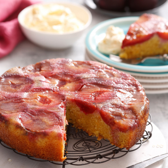 - Mix together mascarpone, zest, juice and icing sugar. Turn the cake out onto a plate plum side up. Serve warm or cooled with mascarpone