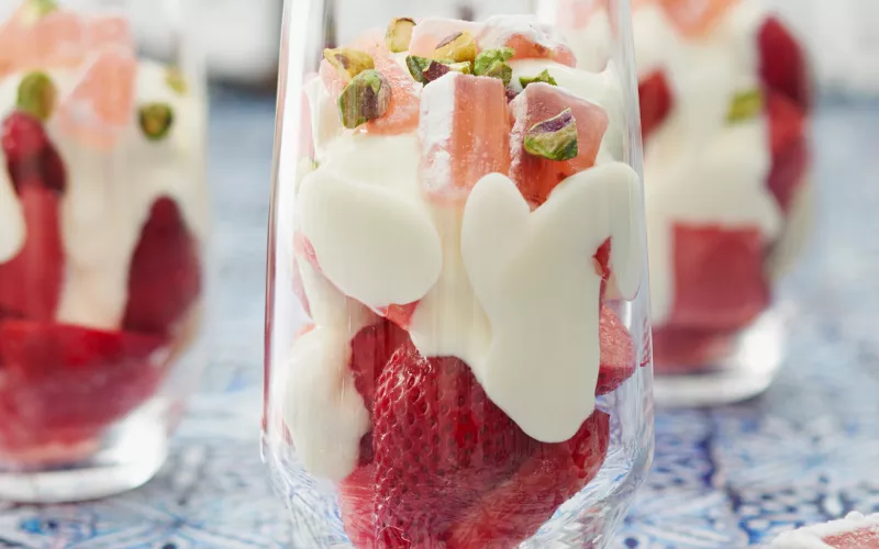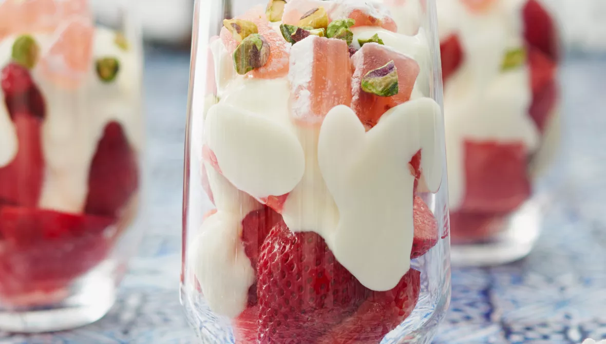 Make a Turkish dessert recipe with Turkish delight as a dinner party entertaining idea. Serve this dessert in glass recipe with strawberries and watermelon and top your cream cheese dessert recipe with pistachio nuts.