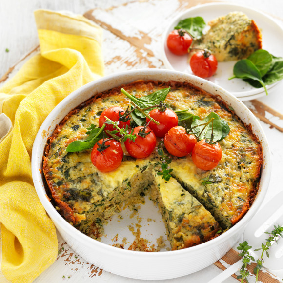 - Add quinoa and spinach into the baking dish and pour over the egg mixture, stir gently. Cover with a lid or foil and bake until just set for around 30 minutes. Remove lid, sprinkle with cheese and bake uncovered for a further 15 minutes or until golden. Set aside to cool.