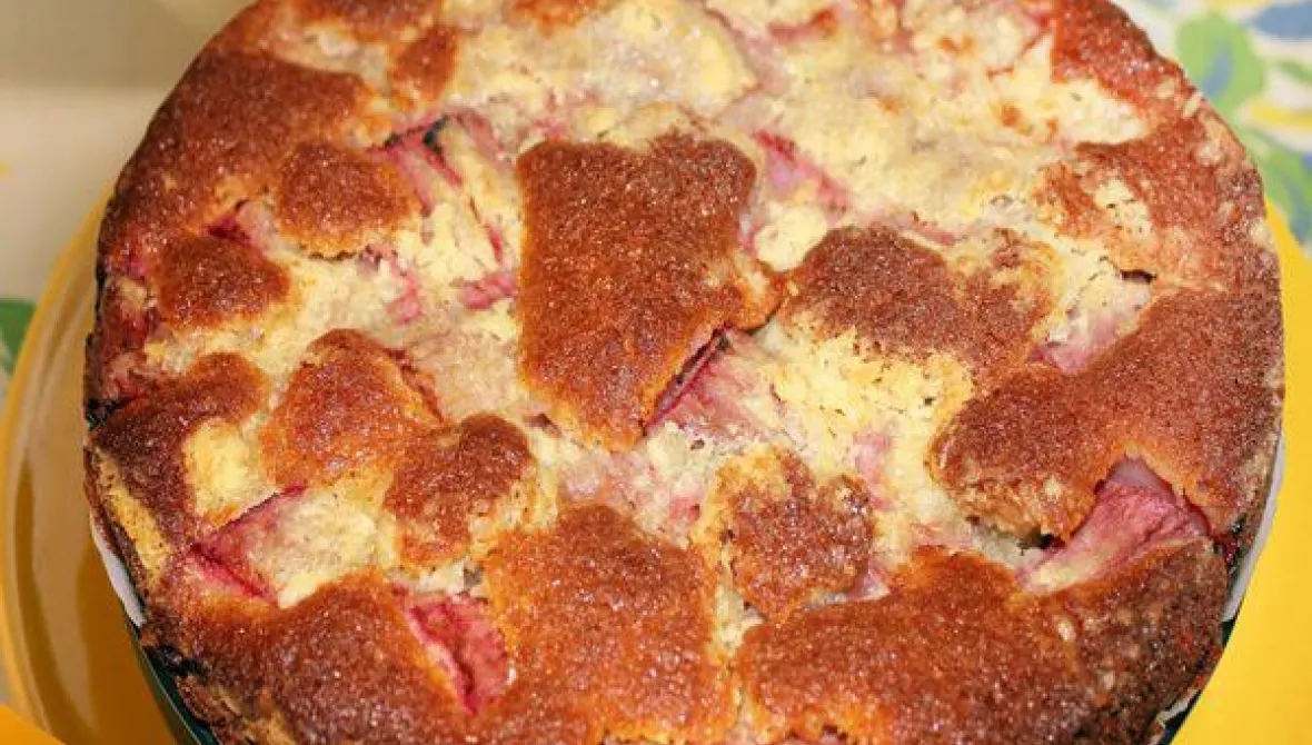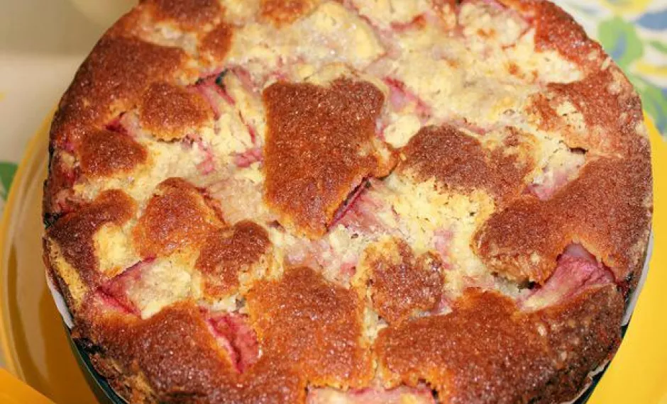 - Pour mixture into cake tin and smooth the top, then place the rhubarb pieces on top of the batter.