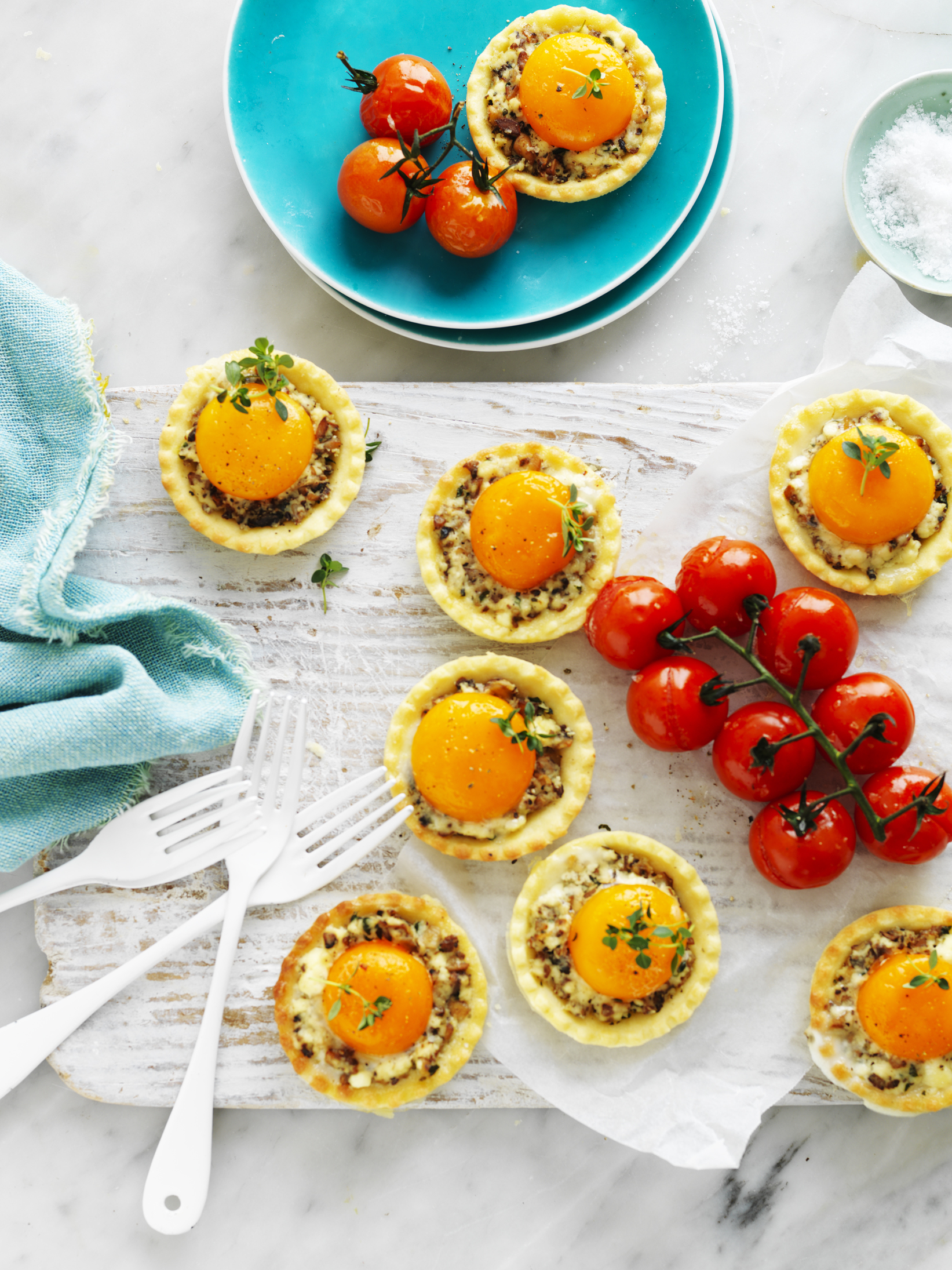 - Add ricotta to mushrooms mixture and stir until well combined. Spoon 3 tsp of mushroom mixture into tarts, spreading up sides to form a dent in the centre. Separate eggs. Place yolks into the centre of tarts. (Egg whites can be place in an airtight container and frozen for later use). Spray tarts with olive oil and loosely cover with foil. Bake for 15-20 minutes or until egg is just set