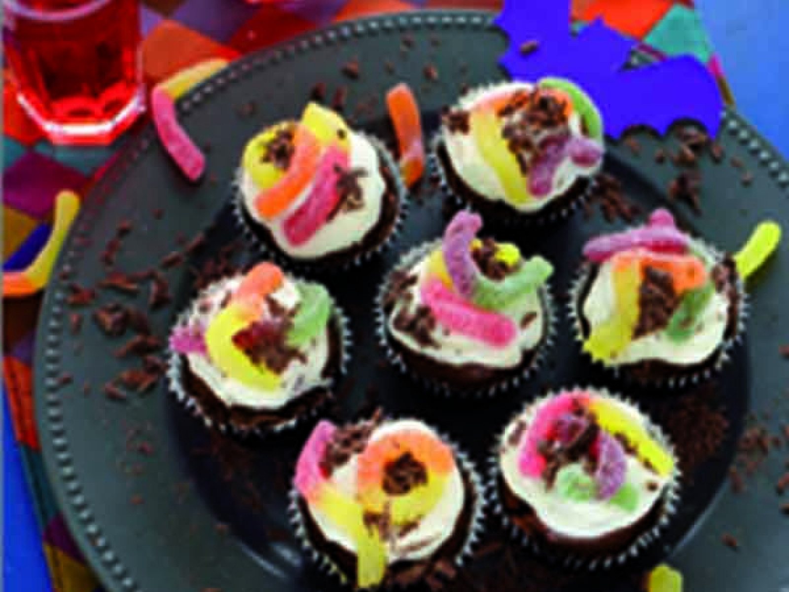 - Combine the icing sugar, butter and enough milk to form an icing of spreadable consistency. Spread over the muffins and decorate with Sour Squirms and grated chocolate. Decorate serving plate with extra Sour Squirms and chocolate if desired