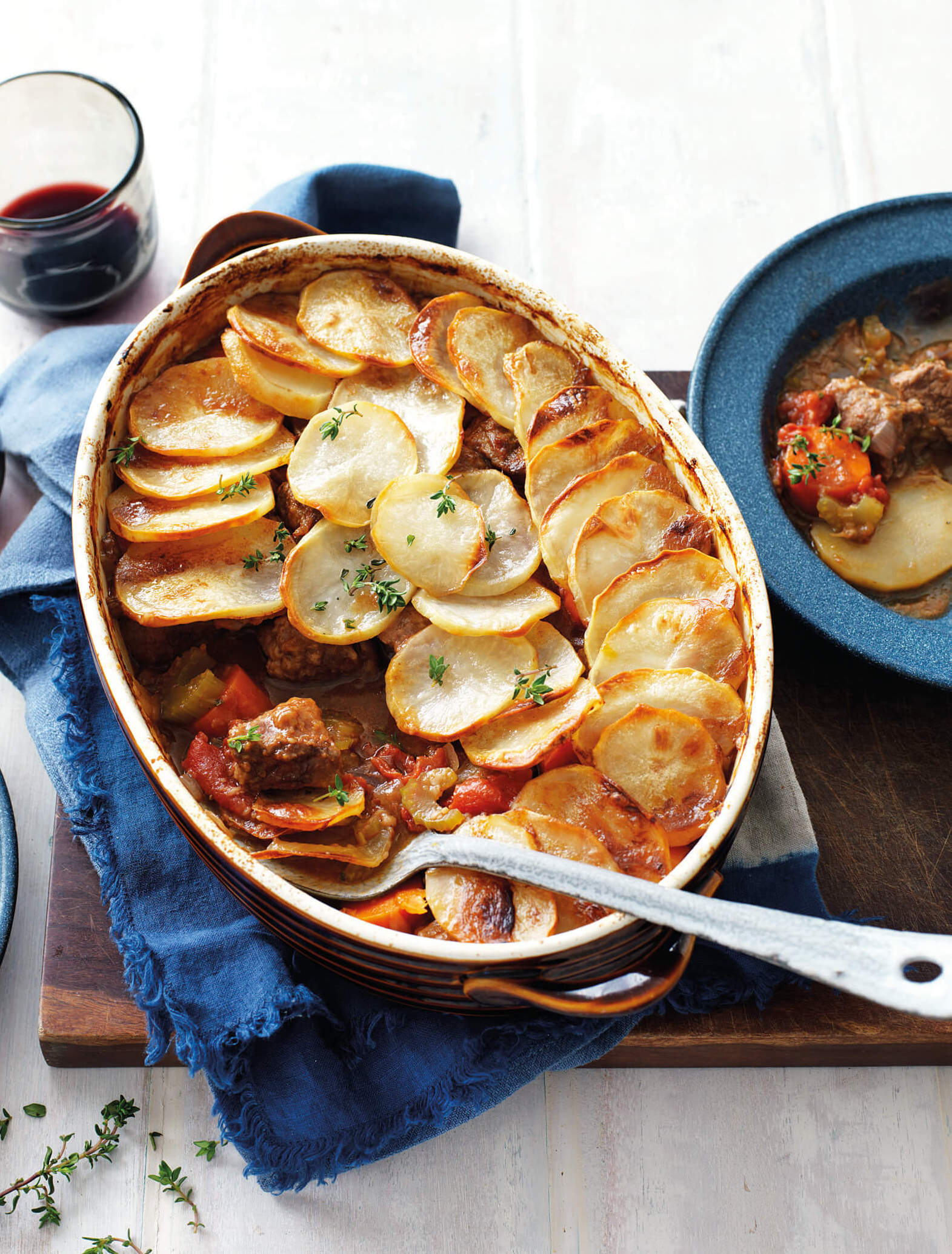 - Carefully remove casserole from oven. Arrange potatoes, overlapping slightly, on top. Spray potatoes liberally with oil. Bake for 1 hour or until potatoes are tender. Increase oven temperature to 200°C/180°C fan-forced and bake for 10-15 minutes until potatoes are golden and crisp on the edges. Sprinkle with thyme and serve with crusty bread