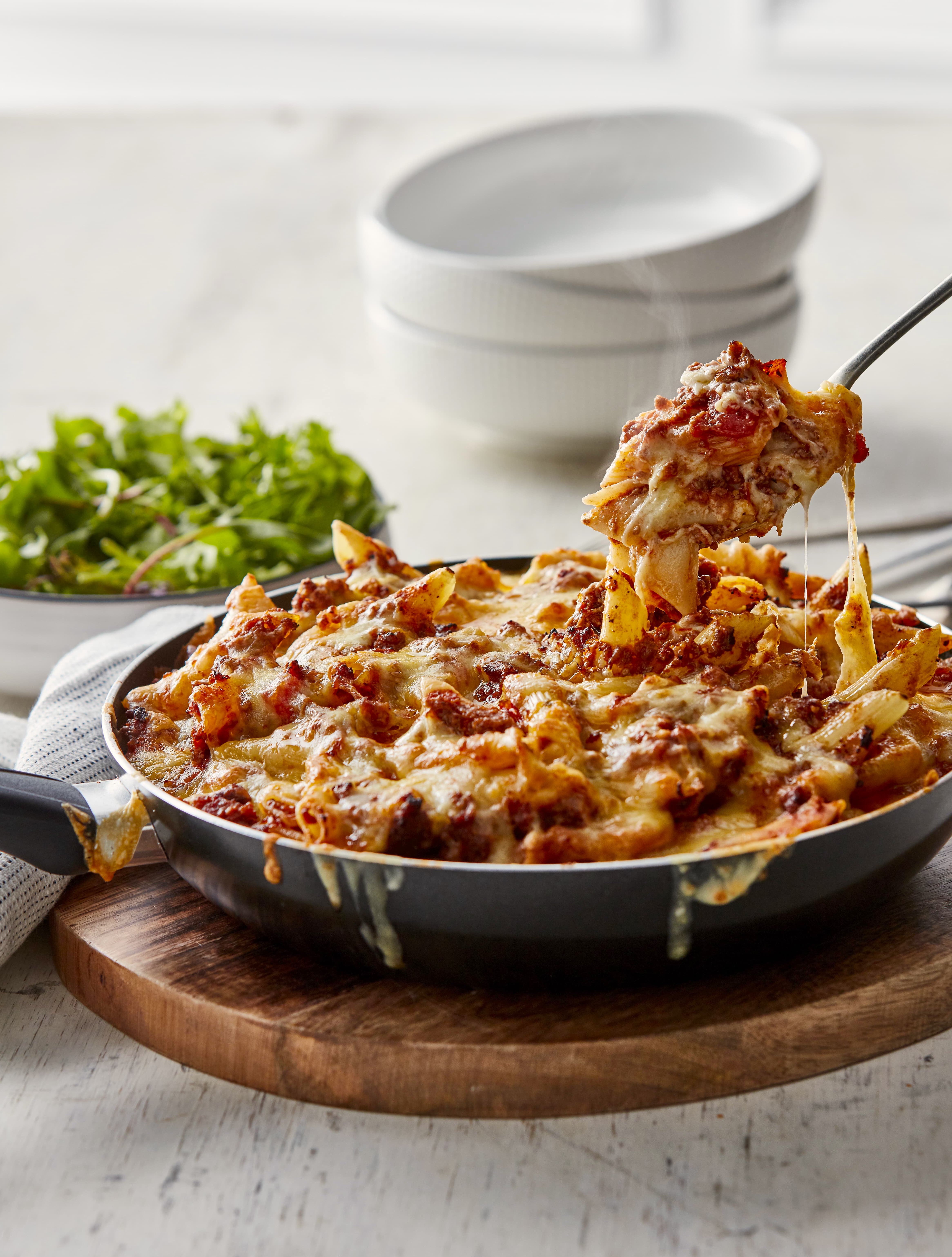 - Spray a 20cm (8 cup capacity), heavy based ovenproof fry pan with olive oil. Spoon half of the pasta mixture into the prepared pan. Top with half of the Perfect Bakes cheese, then remaining pasta mixture. Sprinkle with remaining cheese