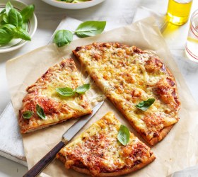 - Turn dough out onto a lightly floured surface and knead gently for another 5 minutes or until smooth. Divide dough in half and roll out pizza bases to 30 cm x 20 cm ovals. Sprinkle a little flour on the bench before rolling to prevent dough from sticking. Transfer bases to prepared trays.