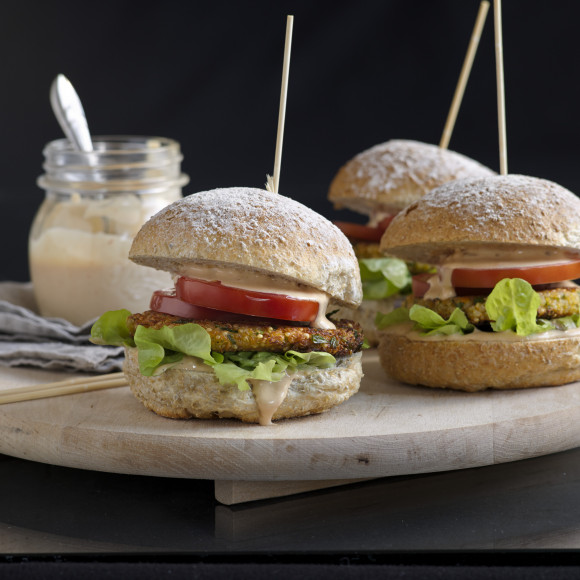- Cut the chia bread rolls into half, spread a light layer of the epic sauce on the bottom half. Top with oakleaf lettuce, quinoa patty and tomato slices