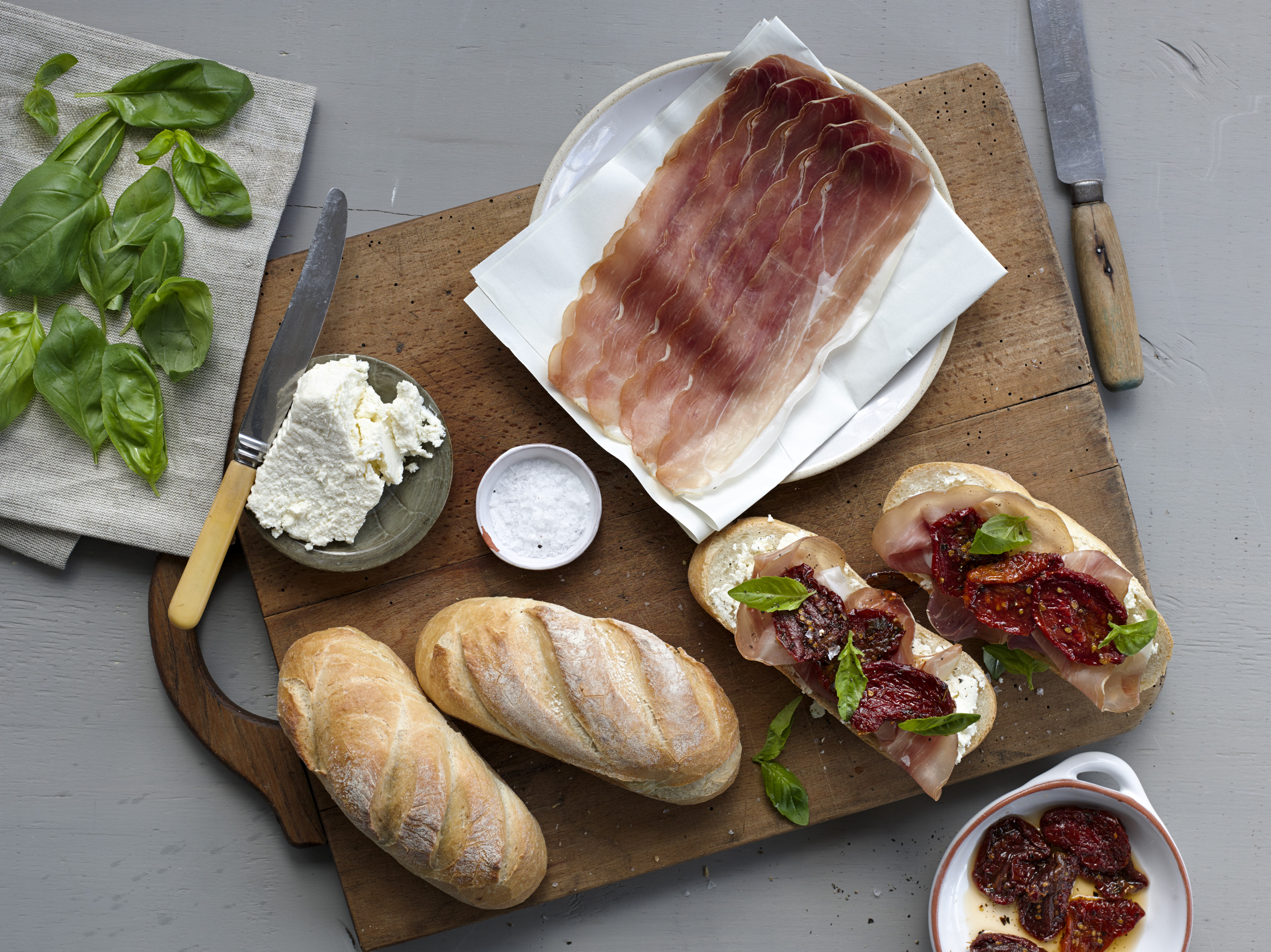 Cut bread rolls in halves and spread ricotta cheese on each side. Place Prosciutto ham, sundried tomatoes and a few fresh basil leaves on one side. Add this recipe to your own personalised cookbook.