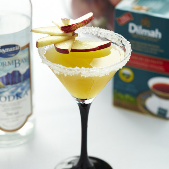 - Add ice, 50ml of brewed tea, apple juice and vodka to cocktail shaker and shake for 10 seconds