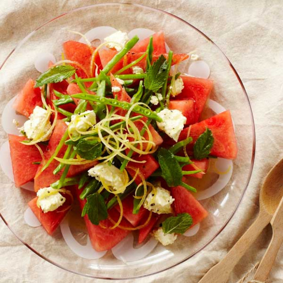 Layer watermelon, snow peas, cheese, mint and lemon zest on a serving platter.