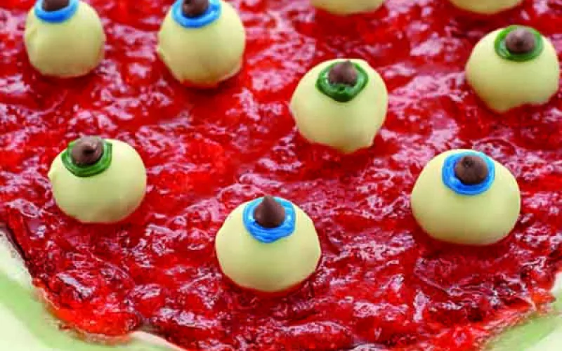- Use a fork to break up the jelly and then transfer to a serving plate. Arrange the eyeballs on the jelly and serve immediately