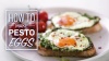 1. Preheat frying pan over medium-high heat. Spoon in pesto, spreading over the pan.