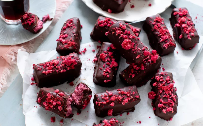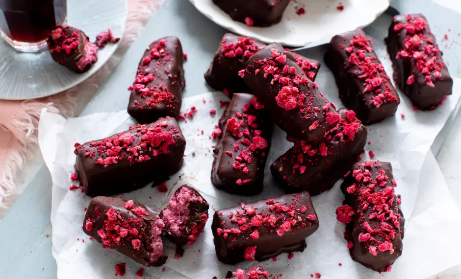 Creamy coconut and raspberry filling covered in rich dark chocolate – these no-bake bars are a simple, perfectly balanced treat. Sweet, smooth and just right for an afternoon pick-me-up.